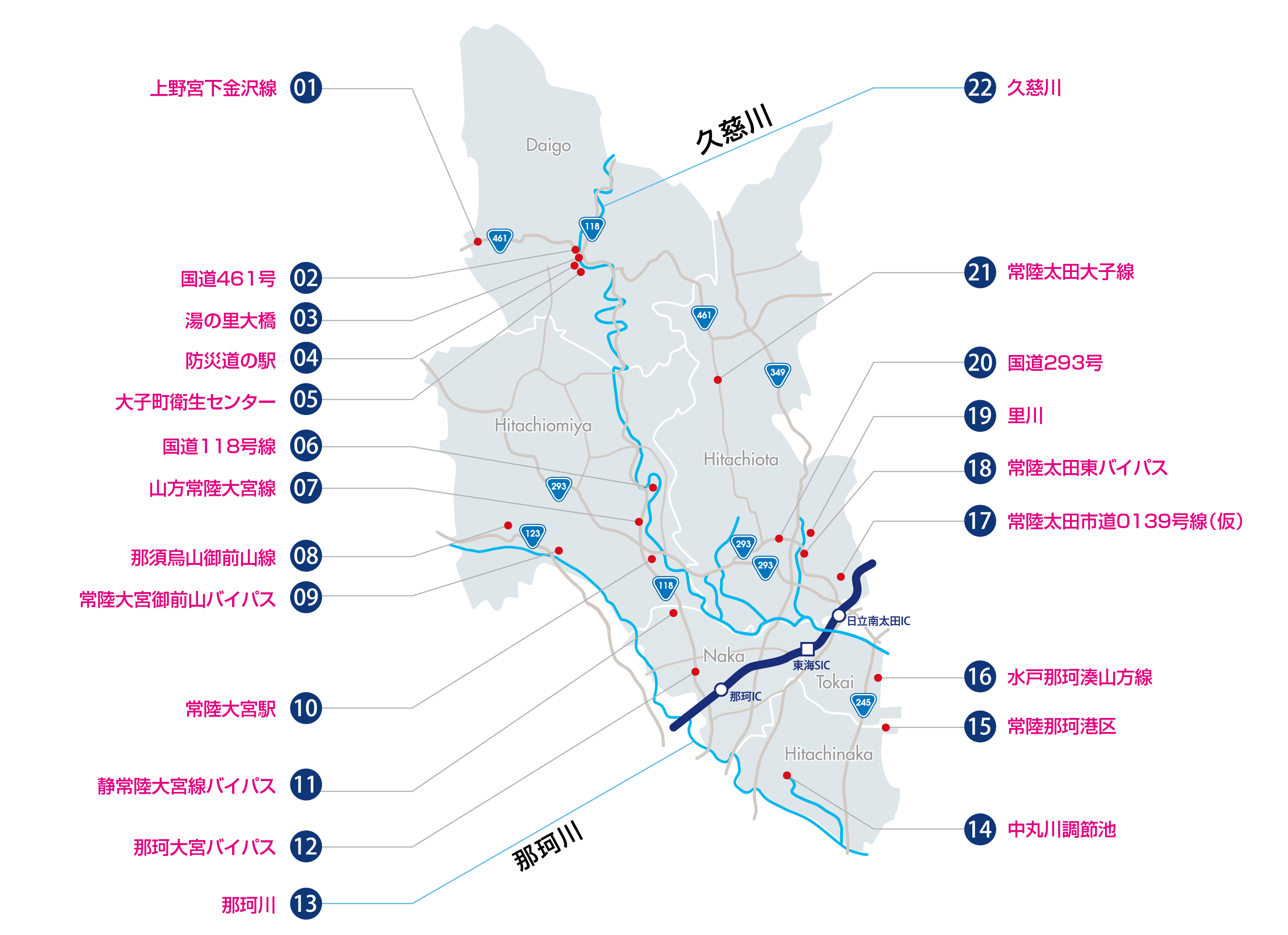 令和6年度の主な事業 ※一部年度をまたいだものもあります。 工事前 01 県道上野宮下金沢線歩道整備(大子町下金沢)(工事前) 工事後 01 県道上野宮下金沢線歩道整備(大子町下金沢)(工事後:令和6年7月) 02 国道461号道路拡幅事業(大子町大子)(令和6年11月) 工事前 03 国道461号線湯の里大橋耐震補強工事(大子町大子)(工事前:令和5年9月) 工事後 03 国道461号線湯の里大橋耐震補強工事(大子町大子)(工事後:令和6年6月) 04 防災道の駅観光交流施設整備事業(大子町大子:大子町旧庁舎)(令和6年3月) 05 大子衛生センター竣工(大子町南田気)(令和6年2月) 06 国道118号線大宮大子拡幅冠水対策(常陸大宮市岩崎ほか)(令和6年9月) 工事前 07 山方常陸大宮線舗装修繕工事(常陸大宮市辰ノ口)(工事前:令和6年4月) 工事後 07 山方常陸大宮線舗装修繕工事(常陸大宮市辰ノ口)(工事後:令和6年6月) 工事前 08 那須烏山御前山線舗装修繕工事(野口平)(工事前:令和5年12月) 工事後 08 那須烏山御前山線舗装修繕工事(常陸大宮市野口平)(工事後:令和6年3月) 09 国道123号線常陸大宮御前山バイパス整備(常陸大宮市御前山)(令和6年12月) 10 常陸大宮駅周辺の新駅舎・東西自由通路などの駅周辺整備(常陸大宮市南町)(令和6年12月) 10 常陸大宮駅周辺の新駅舎・東西自由通路などの駅周辺整備(常陸大宮市南町)(令和7年3月) 1 11 県道静常陸大宮線バイパス開通(南側)(那珂市下大賀)(令和6年7月) 2 11 県道静常陸大宮線バイパス開通(南側)(那珂市下大賀)(令和6年7月) 12 国道118号線那珂大宮バイパス(那珂市飯田)(令和6年4月) 13 那珂川河川整備(那珂川左岸百色山排水樋管改築工事)(令和6年4月) 14 中丸川調節池整備工事(ひたちなか市中根、同長堀町)(令和6年7月) 1 15 常陸那珂港区E岸壁予定地01(令和6年3月) 2 15 常陸那珂港区E岸壁予定地02(令和6年3月) 16 水戸那珂湊山方線道路改良舗装工事(ひたちなか市平磯町)(令和6年3月) 17 常陸太田市道0139号線(仮)真弓トンネル整備(常陸太田市幡町ほか)(令和6年11月) 1 18 国道293号線常陸太田東バイパス整備(常陸太田市瑞龍町、同増井町)(令和6年11月) 2 18 国道293号線常陸太田東バイパス整備(常陸太田市瑞龍町、同増井町)(令和6年11月) 工事前 19 里川河川改修工事(常陸太田市常福地町、同茅根町)(工事前) 工事後 19 里川河川改修工事(常陸太田市常福地町、同茅根町)(令和6年7月) 20 国道293号道路改良工事(常陸太田市増井町)(令和6年7月) 21 常陸太田大子線拡幅工事(常陸太田市天下野)(令和6年7月) 22 久慈川河川改修工事(大子町矢田)(令和6年5月) 過去の事業一覧 令和6年度の主な事業 令和5年度の主な事業 令和4年度の主な事業 令和2年度~3年度の主な事業