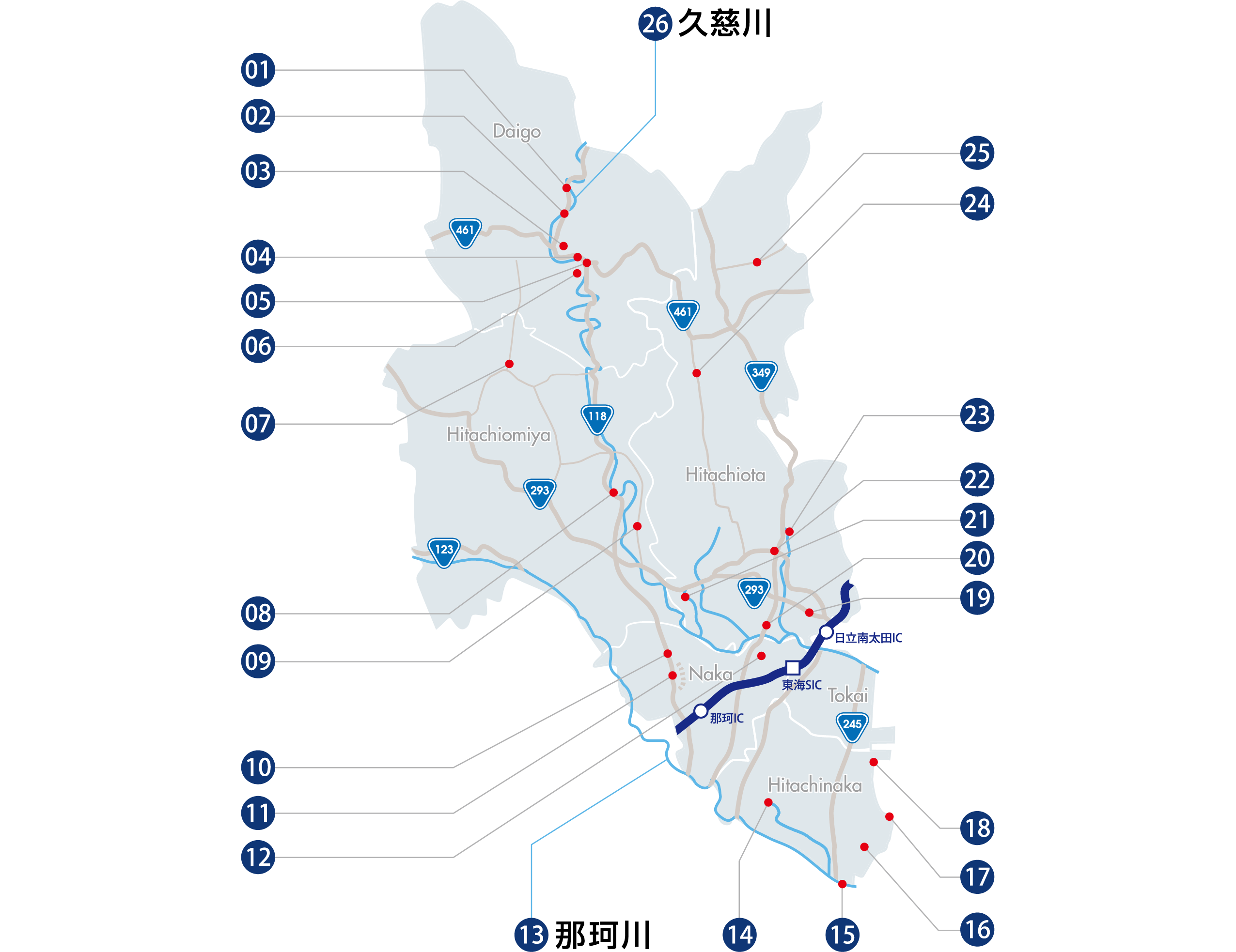 令和4年度の主な事業 01 国道118号線舗装修繕(大子町下野宮)(令和4年3月) 02 国道118号線川山橋橋梁整備(大子町池田~川山)(令和4年1月) 03 大子町新庁舎工事(完成)(大子町北田気)(令和4年8月) 04 国道118号線袋田バイパス北田気大橋整備(大子町北田気)(令和4年11月) 05 国道118号袋田バイパス南田気跨線橋整備(大子町南田気)(令和4年11月) 06 大子町衛生センター建替(大子町南田気)(令和4年11月) 07 県道常陸太田那須烏山線バイパス・片根橋整備(常陸大宮市下檜沢)(令和4年9月) 08 国道118号線山片橋耐震補強工事(常陸大宮市山方)(令和4年1月) 09 県道山方常陸大宮線舗装修繕工事(常陸大宮市辰ノ口)(令和4年9月) 10 国道118号線那珂大宮線4車線化事業(那珂市中里)(令和4年1月) 11 国道118号線那珂大宮バイパス整備(那珂市古徳)(令和4年11月) 12 県道常陸那珂港山方線歩道修繕(那珂市額田北郷)(令和4年1月) 13 那珂川大場遊水地整備(常陸大宮市城里町)(令和4年3月) 13 那珂川堤防整備(ひたちなか市勝田地区柳沢工区)(令和4年3月) 13 那珂川堤防整備(ひたちなか市勝田地区三反田工区)(令和4年3月) 14 中丸川調節池整備(ひたちなか市東石川)(令和4年1月) 15 国道245線那珂湊拡幅(湊大橋)(ひたちなか市関戸)(令和4年1月) 16 県道那珂湊大洗線歩道整備(ひたちなか市南神敷台)(令和4年11月) 17 県道水戸那珂湊線拡幅整備(ひたちなか市平磯町)(令和4年3月) 18 常陸那珂港区整備(ひたちなか市)(令和4年1月) 19 国道293号線舗装修繕(常陸太田市小目町)(令和4年3月) 20 国道349号歩道新設工事(常陸太田市山下町地内(令和4年6月) 21 浅川樹木伐採河道拡幅工事(常陸太田市大方町)(令和4年3月) 22 国道293号線常陸太田東バイパス整備(常陸太田市増井町地内)(令和4年6月) 23 里川樹木伐採河道拡幅工事(常陸太田市常福地町、茅根町)(令和4年10月) 24 県道常陸太田大子線道路改良工事(常陸太田市天下野町)(令和4年11月) 25 県道北茨城大子線道路改良舗装工事(常陸太田市里川町)(令和4年3月) 26 久慈川堤防整備(常陸大宮市家和楽)(令和4年3月) 26 久慈川堤防整備(常陸大宮市舟生)(令和4年3月) 26 久慈川河道掘削(常陸大宮市小貫地先)(令和4年3月) 過去の事業一覧 令和6年度の主な事業 令和5年度の主な事業 令和4年度の主な事業 令和2年度~3年度の主な事業
